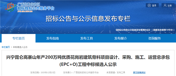 12月23日,廣西招投標公共服務平臺發(fā)布南寧交投旗下南寧凱晟新材料有限公司興寧昆侖高寨山年產200萬噸優(yōu)質花崗巖建筑骨料項目設計、采購、施工、運營總承包(EPC+O)工程中標候選人公示。