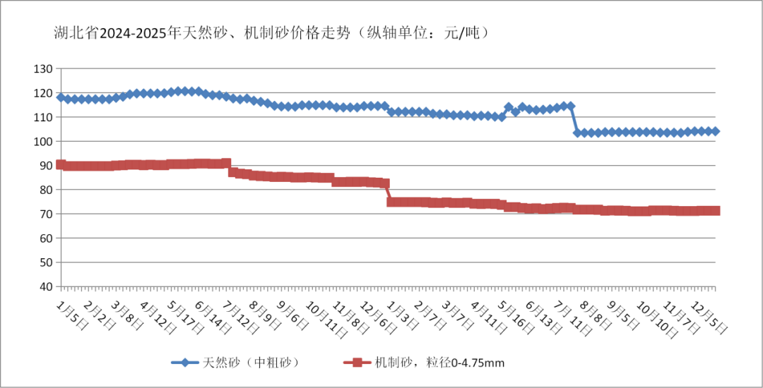 12月,天然砂與機(jī)制砂價(jià)格出現(xiàn)環(huán)比小幅上漲。其中,天然砂(中粗砂)全省均價(jià)為104.10元/噸,環(huán)比上漲0.49%;機(jī)制砂均價(jià)為71.28元/噸,環(huán)比微漲0.01%。盡管環(huán)比有所回暖,但與2024年同期相比,兩者價(jià)格仍分別處于9.11%和14.09%的下降區(qū)間,反映出2024年以來(lái)砂類產(chǎn)品整體價(jià)格水平仍顯著低于上年同期。