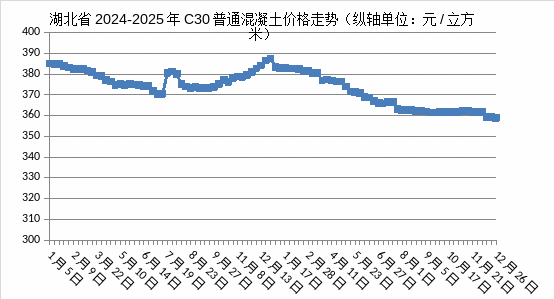12月,作為下游主要成品,普通混凝土價(jià)格隨原材料價(jià)格下行而同步下跌。強(qiáng)度等級(jí)C30普通混凝土全省均價(jià)為359.84元/立方米,環(huán)比下降0.60%,同比下降6.62%。