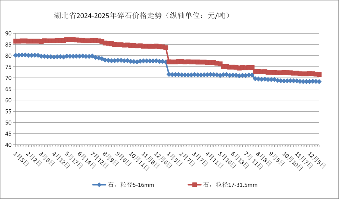 與砂類走勢(shì)不同,碎石價(jià)格12月環(huán)比輕微下跌。監(jiān)測(cè)的兩種規(guī)格碎石(粒徑5-16mm、17-31.5mm)全省均價(jià)分別為68.39元/噸和71.74元/噸,環(huán)比降幅分別為0.07%和0.22%。同比來(lái)看,跌幅更為明顯,均超過11%,顯示碎石市場(chǎng)同比仍處低位運(yùn)行。