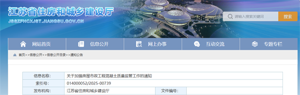 近日,江蘇省住建廳發(fā)布《關(guān)于加強房屋市政工程混凝土質(zhì)量監(jiān)管工作的通知》。《通知》明確從源頭管控、過程把控、監(jiān)管創(chuàng)新、專項抽查等多維度,構(gòu)建混凝土質(zhì)量全鏈條監(jiān)管體系。