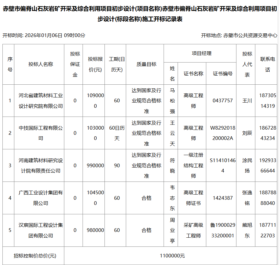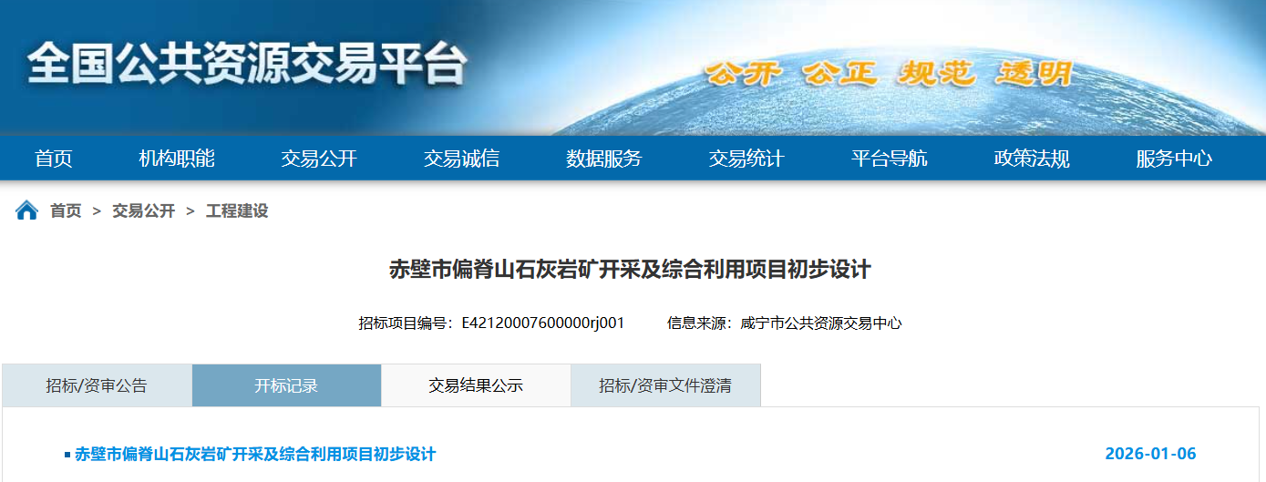 近日,全國公共資源交易平臺發布赤壁市偏脊山石灰巖礦開采及綜合利用項目初步設計(標段名稱)施工開標記錄,共5家單位入選。