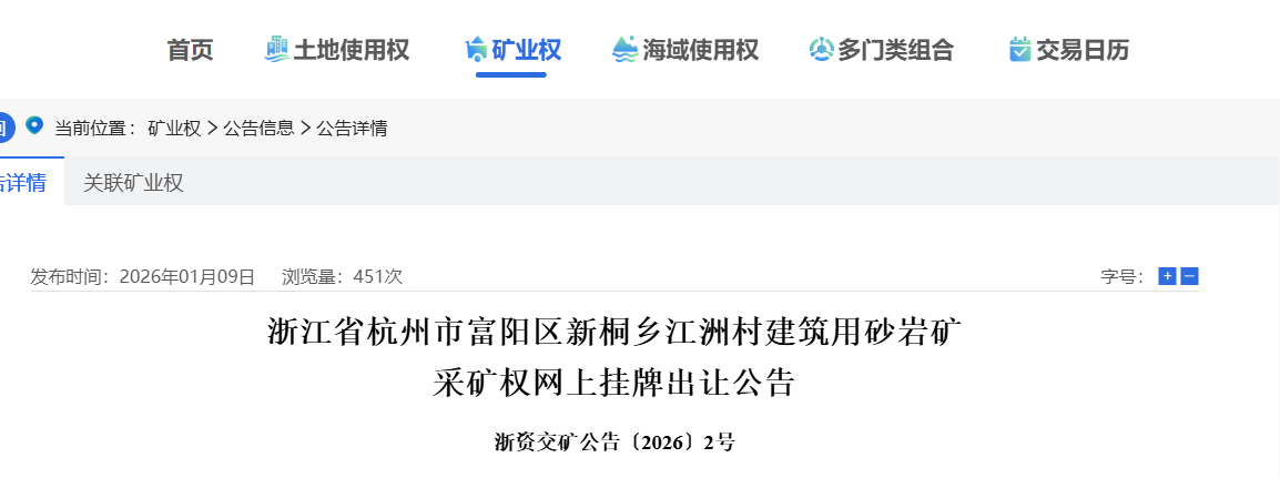 近日,浙江省杭州市規(guī)劃和自然資源局富陽分局掛牌出讓杭州市富陽區(qū)新桐鄉(xiāng)江洲村建筑用砂巖礦采礦權(quán),礦區(qū)范圍內(nèi)共計(jì)出讓資源量3980萬噸(1479.2萬立方米),其中建筑用砂巖礦2456.6萬噸(916.6萬立方米),宕碴1523.4萬噸(562.6萬立方米),采礦權(quán)期限:5年(含基建期6個(gè)月),設(shè)計(jì)建設(shè)規(guī)模980萬噸/年,4億元起拍,加之超2億元的“凈礦”出讓成本,該礦權(quán)獲得成本約15元/噸。