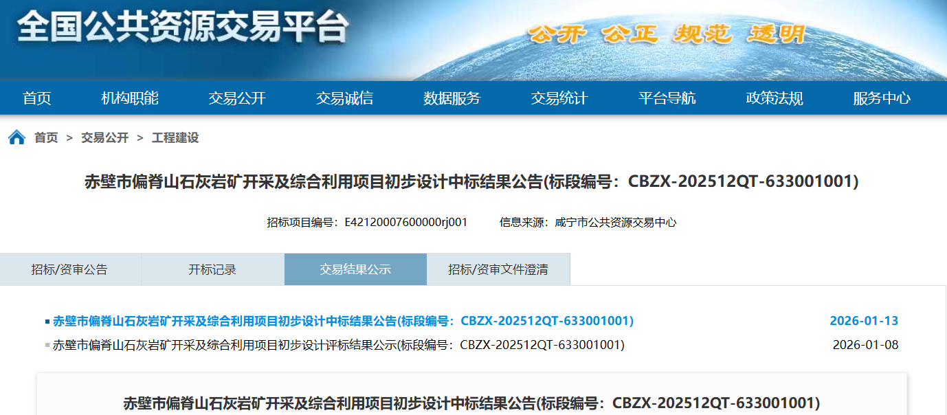 赤壁市偏脊山石灰?guī)r礦開采及綜合利用項目初步設計于 2026年01月08日在咸寧市電子招標投標交易平臺(媒介名稱)上發(fā)布了評標結果公示,公示期為 2026年01月08日至 2026年01月12日。招標人已經(jīng)依法確定中標人并對本次招標的中標結果予以公告: