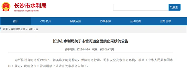1月20日,湖南長(zhǎng)沙市水利局發(fā)布公告,明確對(duì)瀏陽(yáng)河、撈刀河、溈水河、靳江河、沙河等五條市管河道實(shí)施全線禁止采砂管理(經(jīng)行政許可的河道整治、航道整治、清淤疏浚等除外)。禁采期限自即日起至2030年12月31日止。此次全域禁采旨在通過(guò)嚴(yán)格管控河道采砂秩序,維護(hù)河勢(shì)穩(wěn)定與水生態(tài)安全。