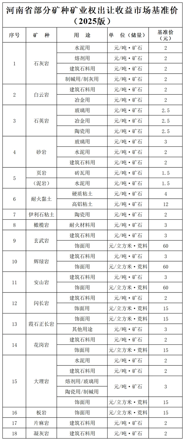 日前,河南省自然資源廳印發(fā)《河南省部分礦種礦業(yè)權出讓收益市場基準價(2025版)的通知》,對18個礦種的基準價進行了調整。在砂石礦山出讓基準價方面,通知明確,針對石灰?guī)r等13個以建筑石料為主的礦種——由于當前市場需求、成品價格降幅較大,相關基準價作出下調調整,由原來的3元/噸調整到2元/噸,重新恢復到2018年的水平。
