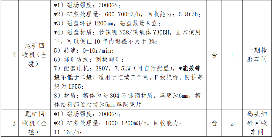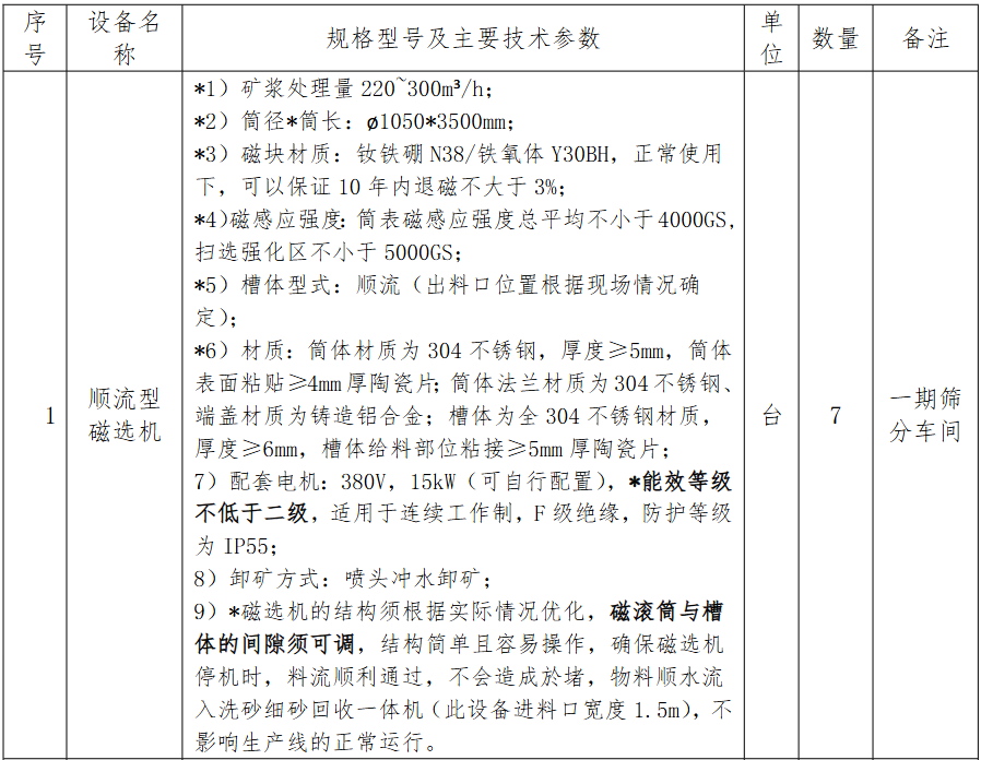 根據(jù)公告內(nèi)容,招標(biāo)范圍包括長(zhǎng)崍項(xiàng)目一期篩分車間的7臺(tái)磁選機(jī)、一期棒磨車間的1臺(tái)盤(pán)式尾礦回收機(jī)、陸域水洗細(xì)砂回收車間的2臺(tái)尾礦回收機(jī),包括但不限于磁選機(jī)及尾礦回收機(jī)本體、電氣控制柜等設(shè)備及附件、其他滿足設(shè)備正常工作所需要的所有部件;設(shè)備交付前的現(xiàn)場(chǎng)技術(shù)聯(lián)絡(luò)、現(xiàn)場(chǎng)指導(dǎo)安裝、設(shè)備調(diào)試、培訓(xùn)服務(wù)等;隨機(jī)備品備件及易耗品、隨機(jī)專用工具;技術(shù)文件以及對(duì)設(shè)備進(jìn)出料槽優(yōu)化設(shè)計(jì)等有關(guān)的技術(shù)服務(wù)等,并提供18個(gè)月質(zhì)量保證服務(wù)。