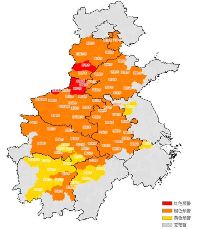 其中,河南安陽、鶴壁、新鄉(xiāng)及河北邢臺啟動(dòng)紅色預(yù)警(Ⅰ級),天津及河北多地啟動(dòng)橙色預(yù)警,江蘇、浙江部分城市啟動(dòng)黃色預(yù)警。