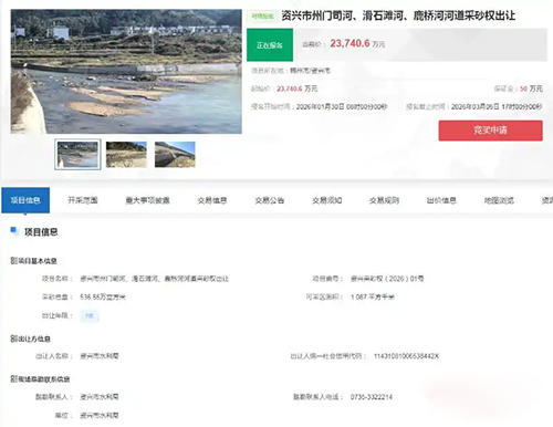 1月30日,湖南省資產(chǎn)資源交易平臺首宗采砂權(quán)交易在郴州市正式掛牌出讓,標(biāo)的為資興市州門司河、滑石灘河及鹿橋河河道砂石開采經(jīng)營權(quán)。該項(xiàng)目可采砂石總量536.55萬立方米,經(jīng)營權(quán)期限7年,出讓起始價(jià)2.374億元。