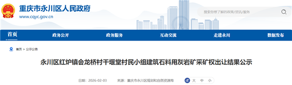 根據(jù)公告,該采礦權(quán)位于永川區(qū)紅爐鎮(zhèn)會龍橋村干堰堂村民小組,面積0.2861平方公里。出讓采礦權(quán)范圍涉及影響中石化《重慶四川盆地榮昌-永川地區(qū)石油天然氣頁巖氣勘察》區(qū)塊永頁7平臺、永頁36平臺的部署和實(shí)施,競得人應(yīng)與中石化簽訂互不影響協(xié)議。