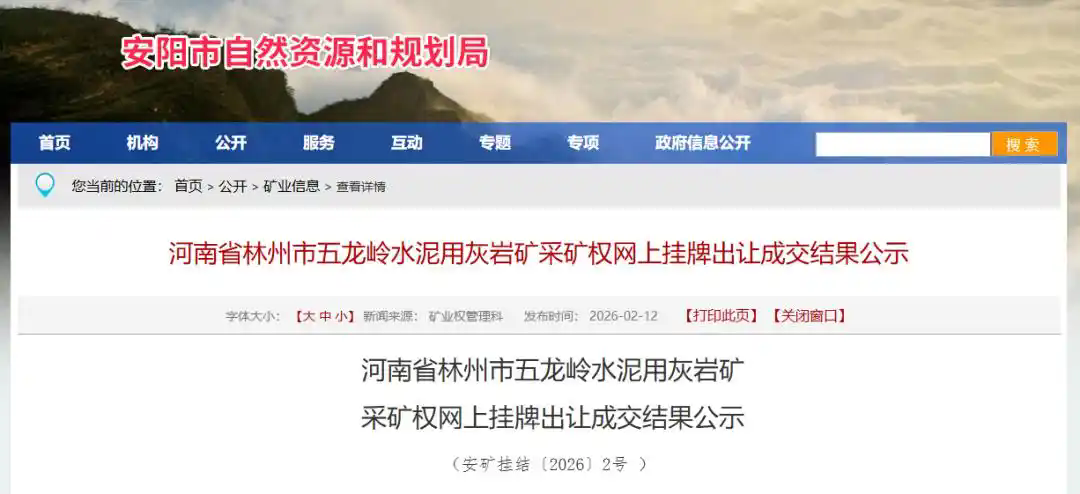 日前,河南安陽市自然資源和規(guī)劃局發(fā)布林州市五龍嶺水泥用灰?guī)r礦采礦權(quán)掛牌出讓成交結(jié)果,林州中聯(lián)新材料有限公司底價1.67億元競得該礦權(quán)。該項目礦區(qū)范圍內(nèi)水泥用灰?guī)r可利用資源量5694.6萬噸,設(shè)計礦山總開采規(guī)模600萬噸/年。經(jīng)計算,該項目競得單價2.9元/噸。