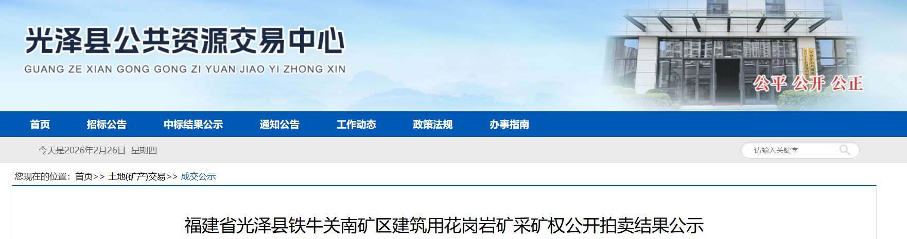 近日,福建省光澤縣光澤縣公共資源交易中心發(fā)布公告,福建省光澤縣祥彬石材有限公司競得福建省光澤縣鐵牛關(guān)南礦區(qū)建筑用花崗巖礦采礦權(quán),該礦權(quán)資源儲量1274.7萬方,礦權(quán)擬出讓年限20年,7732萬元成交價,單價約為6元/方。