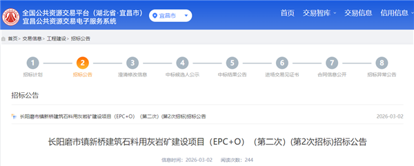 3月2日,湖北省宜昌市長陽磨市鎮(zhèn)新橋建筑石料用灰?guī)r礦建設(shè)項目(EPC+O)再次公開招標。據(jù)悉,該項目第一次招標時因原中標聯(lián)合體主動終止合作,經(jīng)行業(yè)監(jiān)管部門核準后重新啟動招標;第二次又因有效投標單位不足3家而招標失敗。本次重新啟動招標,投標截止時間為2026年3月23日。