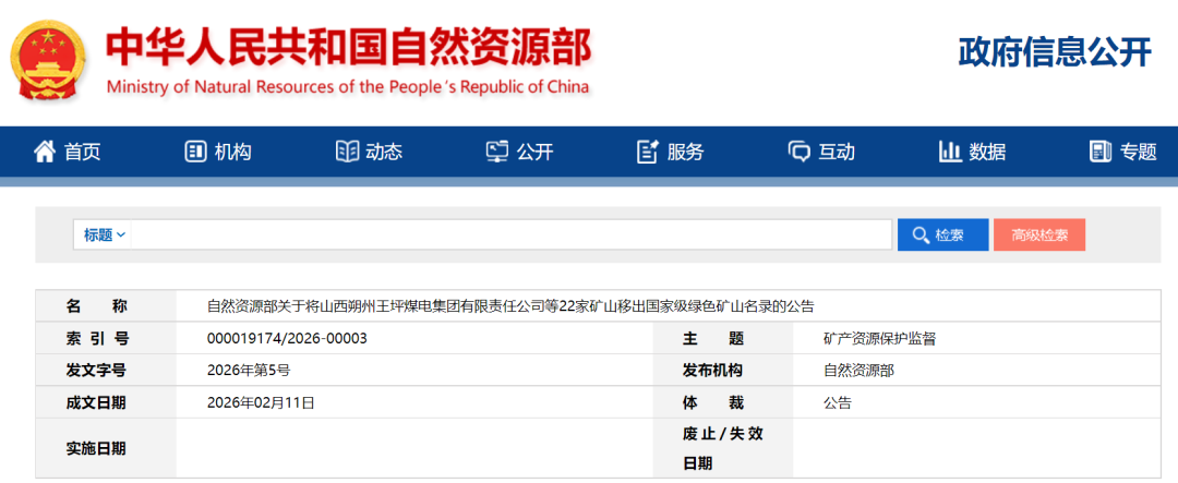 2月11日,自然資源部發(fā)布公告,根據(jù)相關(guān)管理規(guī)定,決定將山西朔州王坪煤電集團(tuán)有限責(zé)任公司等22家礦山,移出國(guó)家級(jí)綠色礦山名錄。此次移出涉及多個(gè)省份、多類礦種,背后均存在明確違規(guī)或異常情形,值得行業(yè)重點(diǎn)關(guān)注。