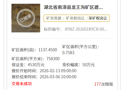 日前,據(jù)湖北公共資源產(chǎn)權(quán)交易平臺消息,湖北省襄陽南漳縣掛牌出讓的龍王溝礦區(qū)建筑石料用灰?guī)r礦交易未成功。據(jù)悉,該礦資源儲量超2.4億噸,擬出讓年限30年,起始價約2.27億元。折合資源價款0.94元/噸。