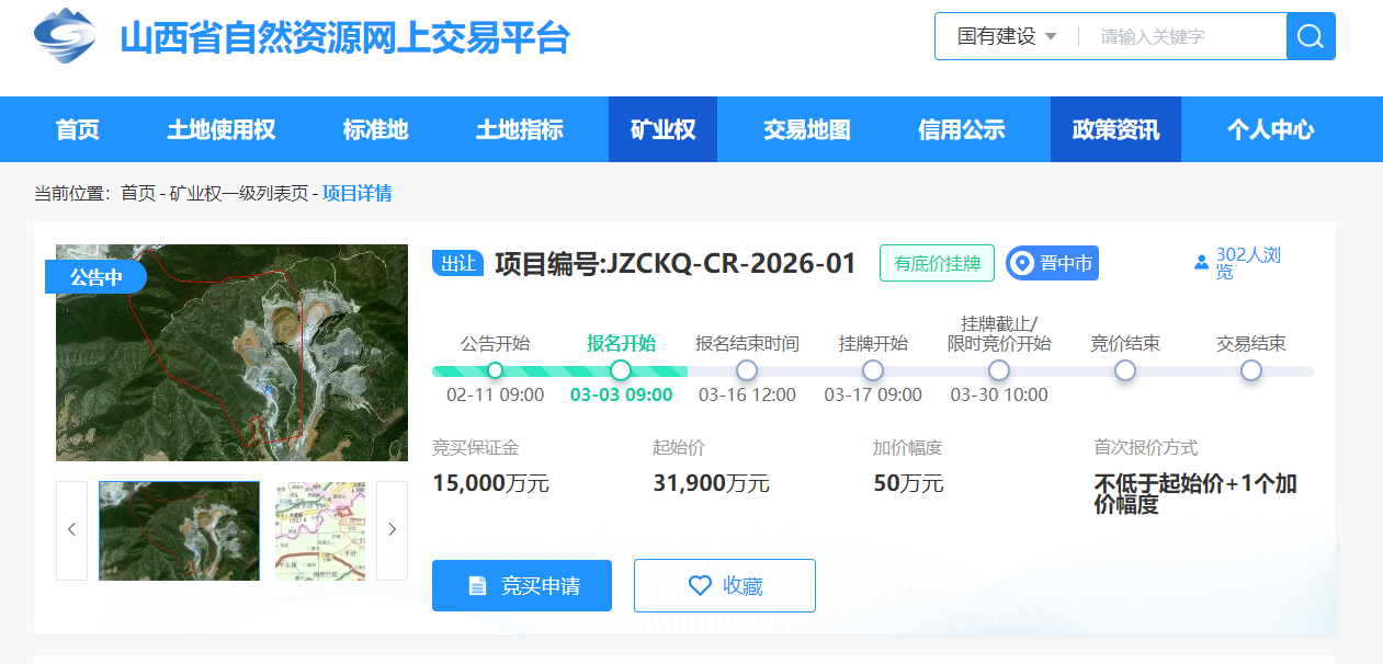 根據(jù)出讓公告,意向競買人需繳納保證金人民幣15000萬元,保證金到賬截止時間2026年3月16日12:00止。競得人進入礦山基礎(chǔ)建設(shè)階段,按綠色礦山標準要求進行建設(shè),生產(chǎn)滿三年要納入綠色礦山名錄。