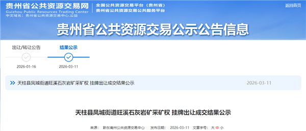 日前,貴州省黔東南州天柱縣鳳城街道旺溪石灰?guī)r礦采礦權(quán)成功出讓,競(jìng)得人為當(dāng)?shù)貒?guó)企——天柱縣勝安礦業(yè)有限責(zé)任公司。該礦資源儲(chǔ)量6750萬(wàn)噸,生產(chǎn)規(guī)模不低于200萬(wàn)方/年(折合675萬(wàn)噸/年),出讓年限10年,成交價(jià)4000萬(wàn)元,資源價(jià)款約0.6元/噸。