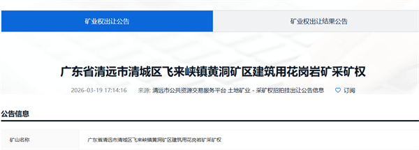 公告顯示,廣東省清遠市清城區(qū)飛來峽鎮(zhèn)黃洞礦區(qū)建筑用花崗巖礦礦區(qū)面積0.5705平方千米,掛牌時間2026年4月17日9時至4月30日10時。掛牌起始價為30109.3萬元,競買報價增價幅度為150萬元的整數(shù)倍,交易保證金為6030萬元。