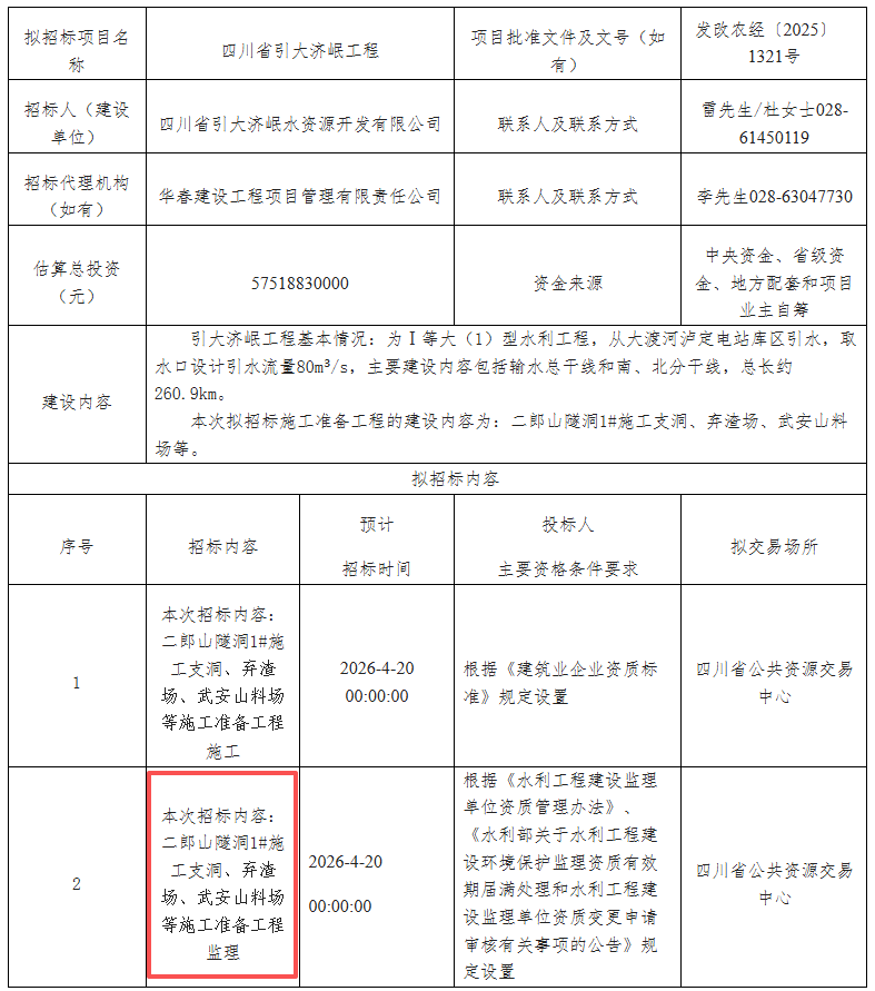 據(jù)悉,四川省引大濟(jì)岷工程是納入《國(guó)家水網(wǎng)建設(shè)規(guī)劃綱要》《成渝地區(qū)雙城經(jīng)濟(jì)圈建設(shè)規(guī)劃綱要》的國(guó)家級(jí)重大水利項(xiàng)目,工程總投資575億元,建設(shè)總工期96個(gè)月,工程規(guī)模宏大、意義深遠(yuǎn)。本次招標(biāo)聚焦施工準(zhǔn)備工程,核心涵蓋施工標(biāo)與監(jiān)理標(biāo)兩大板塊,其中施工標(biāo)明確包含二郎山隧洞1#施工支洞、棄渣場(chǎng)、武安山料場(chǎng)等關(guān)鍵設(shè)施建設(shè),監(jiān)理標(biāo)則同步招標(biāo)施工全過(guò)程監(jiān)理服務(wù),確保施工質(zhì)量與規(guī)范推進(jìn)。招標(biāo)公告明確,2026年4月20日雙標(biāo)段將同步開標(biāo)。