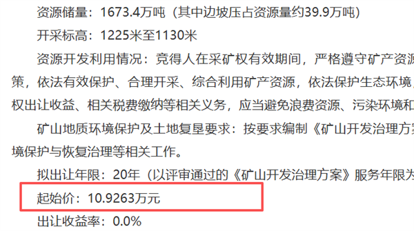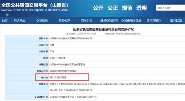 近日,從山西省長治市規(guī)劃和自然資源局獲悉,長治市壺關(guān)縣王章村西石灰?guī)r采礦權(quán)成功出讓。該項目掛牌起始價約10.92萬元,地方民企山西金北宸供應(yīng)鏈有限公司以4.23億元的價格競得該礦權(quán),溢價率高達(dá)387139%。
