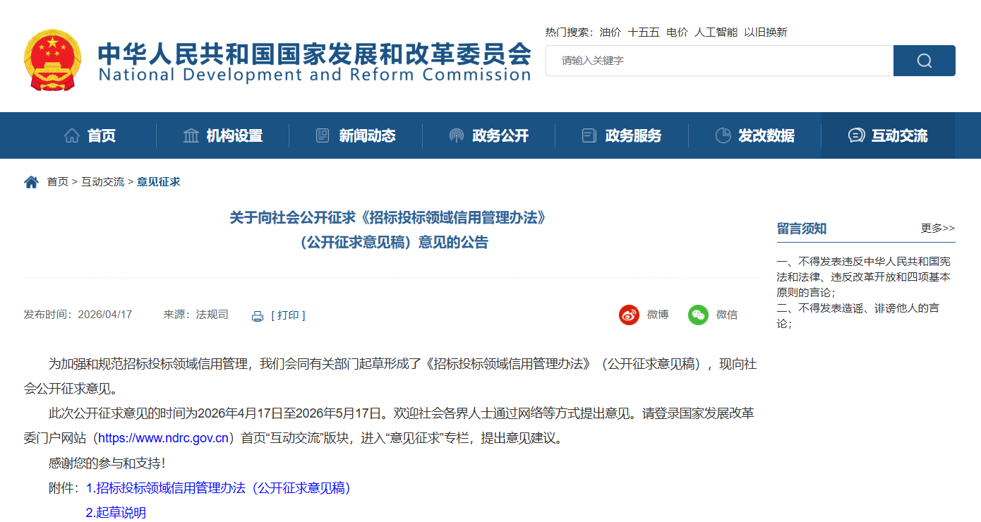 4月17日,國家發改委發布《招標投標領域信用管理辦法(公開征求意見稿)》,面向社會公開征求意見。新規聚焦招投標信用體系建設,將重塑行業監管規則,推動建筑工程及砂石等上下游行業信用管理規范化發展。