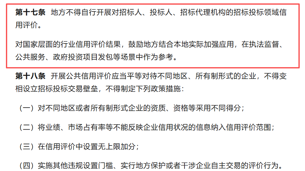征求意見稿明確,各地不得自行開展投標人、招標代理機構屬地化信用評價,全面推行全國統一信用評價規則,破解長期存在的標準不一、區域壁壘、地方保護等突出問題。