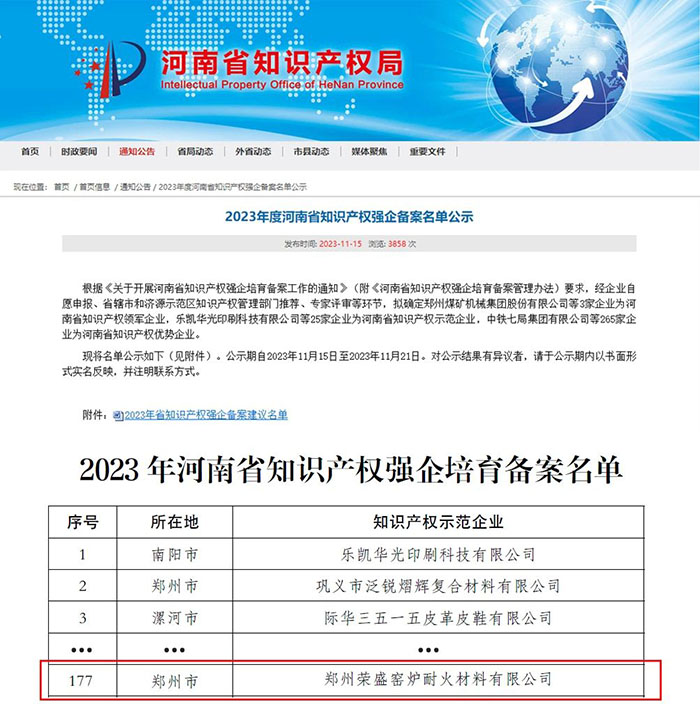 近日,河南省知識(shí)產(chǎn)權(quán)局公布2023年度河南省知識(shí)產(chǎn)權(quán)強(qiáng)企備案名單,鄭州榮盛窯爐耐火材料有限公司(以下簡稱「榮盛耐材」)榮獲「知識(shí)產(chǎn)權(quán)優(yōu)勢(shì)企業(yè)」稱號(hào),知識(shí)產(chǎn)權(quán)綜合實(shí)力獲官方認(rèn)可。這是今年以來,榮盛耐材在知識(shí)產(chǎn)權(quán)領(lǐng)域獲得的又一項(xiàng)榮譽(yù)。
