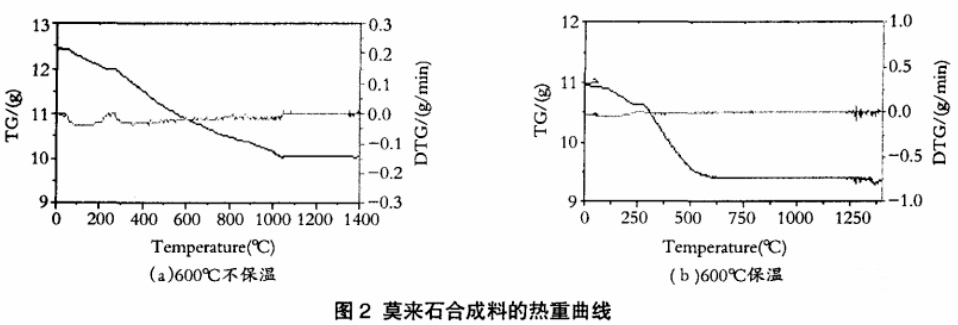 由于DSC-TG分析的測量用料量大多≤100mg,并且要磨成細粉。這種實驗方法很難代表混合料實際的情況,且缺乏均勻性和代表性,從動力學上也不能反映澆注料加熱過程的實阮變化情況。目前對于尺寸和質量大的試樣,只能通過試樣加熱前后質量的變化來表征總的反應情況。用整體的樣塊大試樣加熱更接近真實。大試樣熱重儀對烘干后的試樣進行熱重分析,測定室溫至1400℃過程中重量的變化,結果如圖2(a)所示。由圖可知,在連續加熱不保溫的情況下,質量一直到1100℃才保持穩定。根據DSC-TG及大試樣熱重分析結果,混合料在1200℃以上均可生成莫來石,只是莫來石的生成速度和轉化率隨溫度不同而會有所差異。本工作的主要目的是合成具有微孔結構的莫來石骨料,既要求合成料有一定的氣孔率,孔徑小、體密輕,又要求其強度高,即要有理想的莫來石轉化率,同時還要兼顧煅燒設備投資、生產成本等,因此摸索理想熱處理制度對本工作而言至關重要。