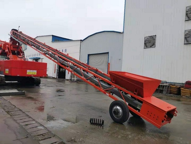 自卸混凝土攪拌車(chē)或運(yùn)輸混凝土的卡車(chē)把攪拌好的混凝土倒入布料機(jī)上料系統(tǒng)的收料斗,收料斗的混凝土掉入下面的環(huán)形皮帶,通過(guò)皮帶的轉(zhuǎn)動(dòng),把混凝土輸送到系統(tǒng)上部與其鉸接的車(chē)架轉(zhuǎn)料斗上,掉到布料皮帶上,實(shí)現(xiàn)混凝土的連續(xù)轉(zhuǎn)運(yùn)和布料。
