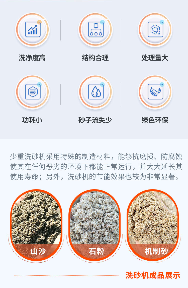 該洗砂機(jī)(洗沙機(jī))用于砂石場洗砂時與傳統(tǒng)的螺旋洗砂機(jī)相比有明顯優(yōu)勢如下: