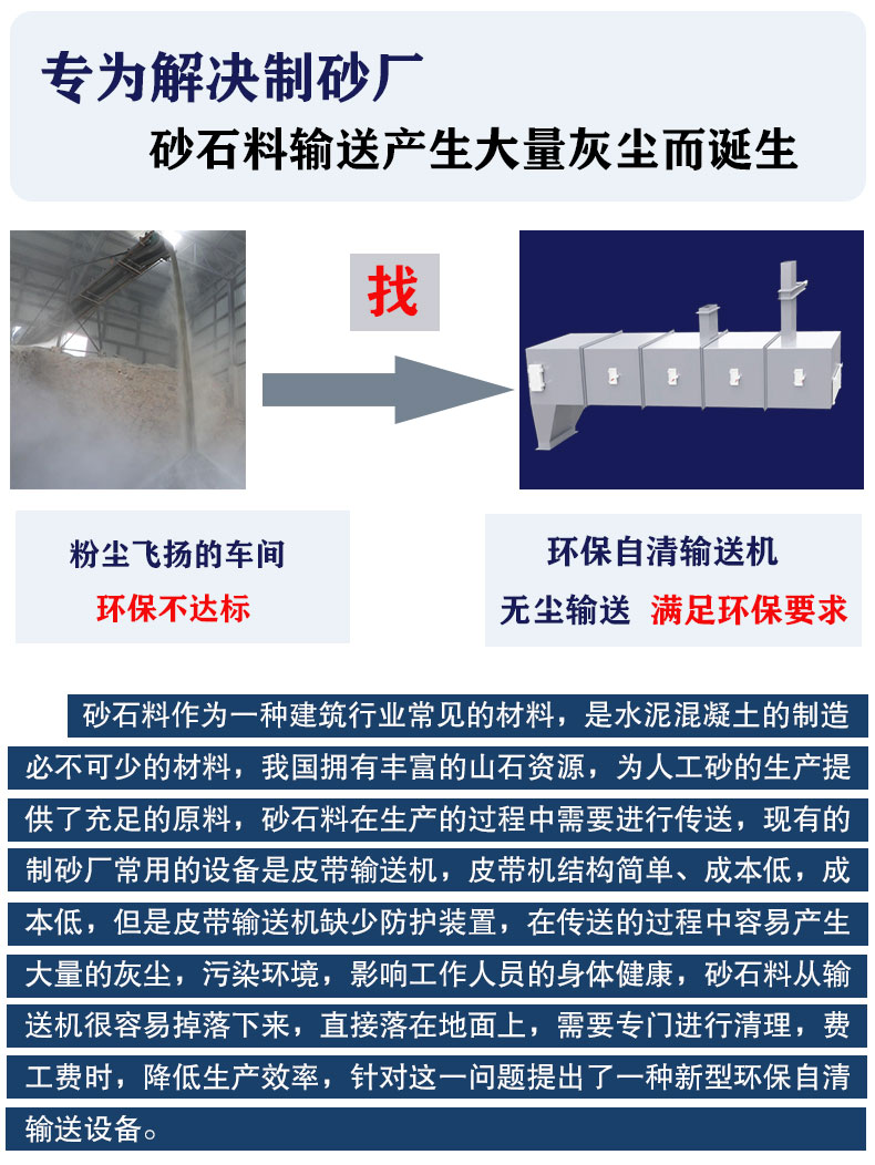 砂石料作為一種建筑行業(yè)常見的材料,是水泥混凝土的制造必不可少的材料,我國擁有豐富的山石資源,為人工砂的生產(chǎn)提供了充足的原料,砂石料在生產(chǎn)的過程中需要進(jìn)行傳送,現(xiàn)有的制砂廠常用的設(shè)備是皮帶輸送機(jī),皮帶機(jī)結(jié)構(gòu)簡單,成本低,但是皮帶輸送機(jī)缺少防護(hù)裝置,在傳送的過程中容易產(chǎn)生大量的灰塵,污染環(huán)境,影響工作人員的身體健康,砂石料從輸送機(jī)很容易掉落下來,直接落在地面上,需要專門進(jìn)行清理,費(fèi)工費(fèi)時,降低生產(chǎn)效率,針對這一問題提出了一種新型環(huán)保自清輸送設(shè)備。