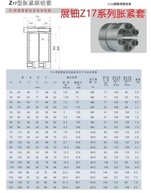 Z17A型系列脹緊套型號如下:Z17A-30×55、Z17A-35×60、Z17A-40×65、Z17A-45×75、Z17A-50×80、Z17A-55×85、Z17A-60×90、Z17A-65×95、Z17A-70×110、Z17A-75×115、Z17A-80×120、Z17A-85×125、Z17A-90×130、Z17A-95×135、Z17A-100×145、Z17A-105×150、Z17A-110×155、Z17A-120×165、Z17A-125×170、Z17A-130×180、Z17A-140×190、Z17A-150×200、Z17A-160×210、Z17A-170×225、Z17A-180×235、Z17A-190×250、Z17A-200×260、Z17A-210×275、Z17A-220×285、Z17A-240×305、Z17A-250×315、Z17A-260×325、Z17A-280×355、Z17A-300×375、Z17A-320×405、Z17A-340×425、Z17A-360×455、Z17A-380×475、Z17A-400×495、Z17A-420×515、Z17A-450×555、Z17A-480×585、Z17A-500×605、Z17A-530×640、Z17A-560×670、Z17A-600×710。注:Z17A型脹緊聯(lián)結(jié)套螺釘?shù)臋C械性能等級為12.9級。