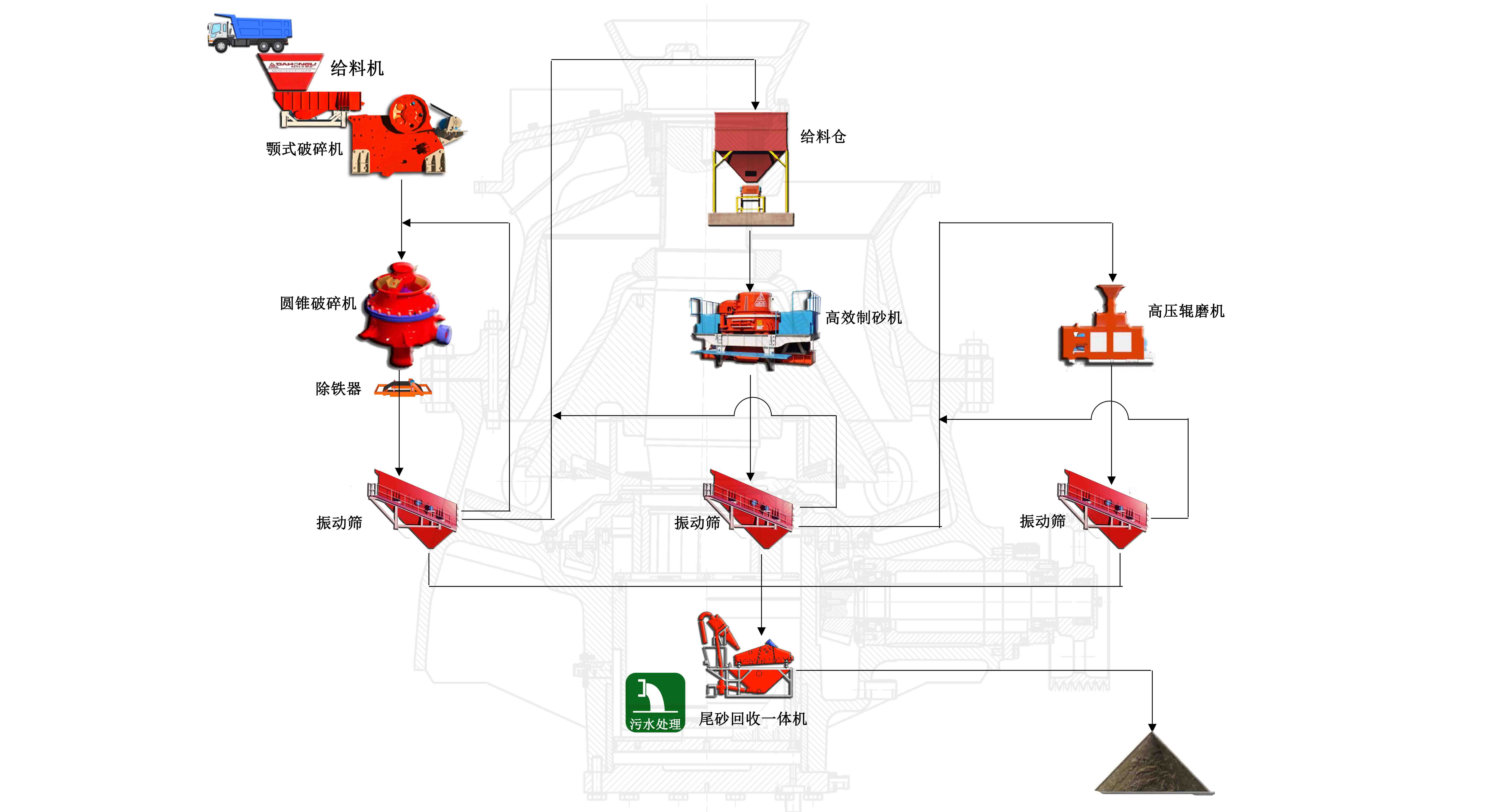 由振動(dòng)給料機(jī)將大粒徑天然原石送進(jìn)鄂式破碎機(jī)中進(jìn)行粗碎;粗碎后的物料由輸送帶送入中間料倉(cāng),然后送入圓錐破碎機(jī)進(jìn)行破碎,由皮帶輸送機(jī)輸送到振動(dòng)分選篩進(jìn)行篩分,滿足粒徑的石料送入高效制砂機(jī)進(jìn)行制砂,不滿足的物料通過(guò)輸送帶返回圓錐破碎機(jī)重新破碎;通過(guò)高效制砂機(jī)出來(lái)的物料也要經(jīng)過(guò)振動(dòng)分選篩篩分后,不滿足的物料則需要通過(guò)輸送機(jī)返回制砂機(jī)再次破碎;篩分后的物料通過(guò)輸送機(jī)送入高壓輥磨機(jī),破碎后進(jìn)行篩分,滿足需求的砂石送入洗砂機(jī)清洗,不滿足的物料返回高壓輥磨機(jī)繼續(xù)破碎;經(jīng)過(guò)洗砂機(jī)的物料通過(guò)尾砂回收一體機(jī)之后,再次經(jīng)過(guò)污水處理設(shè)備后可以由成品輸送帶輸送到成品倉(cāng)存放。具體的流程也可以根據(jù)場(chǎng)地不同,石料的不同而進(jìn)行不同的配置。