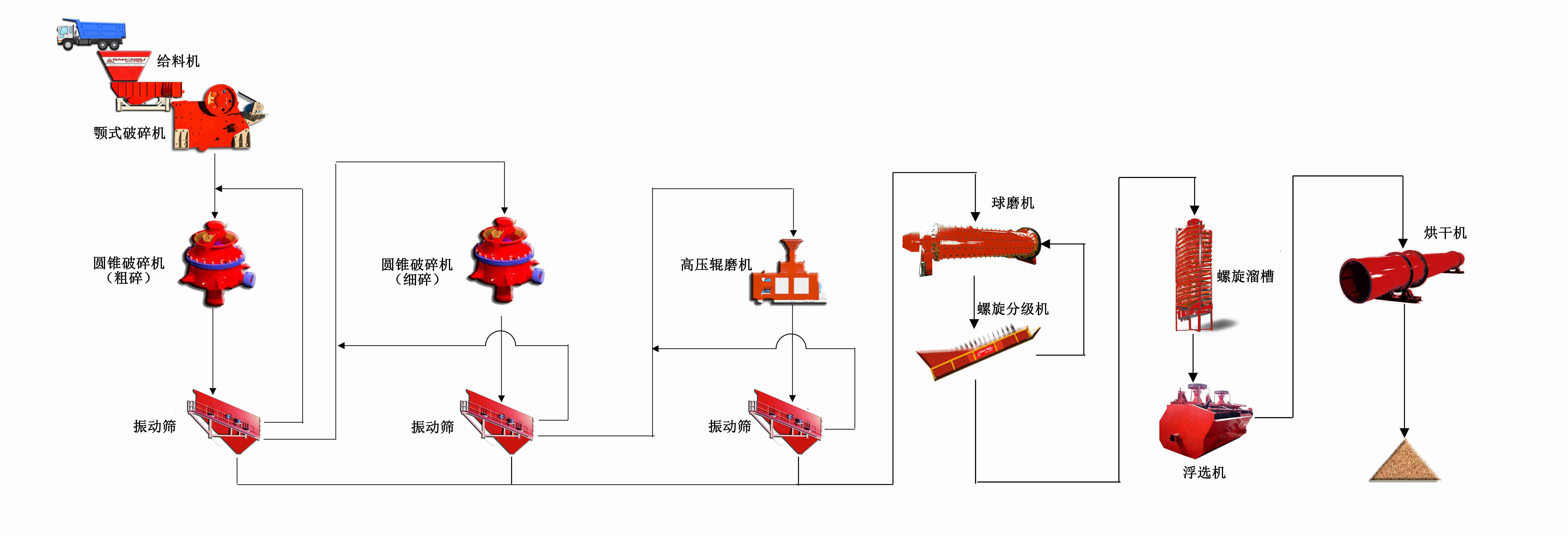 由振動(dòng)給料機(jī)將金礦石原料送進(jìn)鄂式破碎機(jī)中進(jìn)行破碎;破碎后的物料由輸送帶送入圓錐破碎機(jī)(粗碎)進(jìn)行破碎,由皮帶輸送機(jī)輸送到振動(dòng)分選篩進(jìn)行篩分,滿足粒徑的石料再送入圓錐破碎機(jī)(細(xì)碎)進(jìn)行二次破碎,不滿足的物料通過(guò)輸送帶返回圓錐破碎機(jī)(粗碎)重新破碎;通過(guò)細(xì)碎圓錐破碎機(jī)出來(lái)的物料也要經(jīng)過(guò)振動(dòng)分選篩篩分后,不滿足的物料則需要通過(guò)輸送機(jī)返回細(xì)碎圓錐破碎機(jī)再次破碎;滿足的物料則通過(guò)輸送機(jī)送入高壓輥磨機(jī)進(jìn)行研磨破碎。