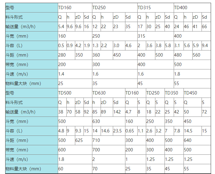 TD膠帶斗式提升機(jī)是適用于垂直輸送粉狀、粒狀、及小塊狀的磨吸性較小的散狀物料,如糧食、煤、水泥、碎礦石等,提升高度40m。其規(guī)格有TD100(不常用)、TD160、TD250、TD315、TD400、TD500、TD630、TD800、TD1000等型號(hào),其中TD160、TD250、TD315等型號(hào)為普遍采用型號(hào)。本系列提升機(jī)代號(hào)為TD,即帶式斗式提升機(jī);產(chǎn)品規(guī)格以斗寬表示。TD帶式斗式提升機(jī)特點(diǎn)為:結(jié)構(gòu)簡(jiǎn)單,運(yùn)行平穩(wěn),挖取式裝料,離心重力式卸料,物料溫度不超過60℃;TD型斗式提升機(jī)備有四種料斗,即:Q型(淺斗)、H型(弧底斗)、ZD型(中深斗)、SD型(深斗)。