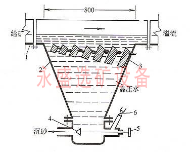 礦漿溜槽;2-分級箱;3-阻砂條;4-砂芯(塞);5-手輪;6-閥門