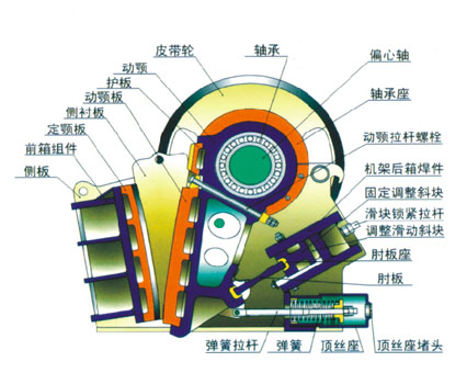 電動(dòng)機(jī)驅(qū)動(dòng)皮帶和皮帶輪,通過(guò)偏心軸使動(dòng)顎上下運(yùn)動(dòng),當(dāng)動(dòng)顎上升時(shí)肘板與動(dòng)顎間夾角變大,從而推動(dòng)動(dòng)顎板向固定顎板接近,與其同時(shí)物料被壓碎或劈碎,達(dá)到破碎的目的;當(dāng)動(dòng)顎下行時(shí),肘板與動(dòng)顎夾角變小,動(dòng)顎板在拉桿,彈簧的作用下,離開(kāi)固定顎板,此時(shí)已破碎物料從破碎腔下口排出