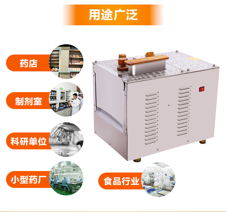 以調(diào)節(jié),廣泛適用于中藥房、藥店、中藥加工場(chǎng)等。本機(jī)具有體積少、效率高、操作簡(jiǎn)便、精巧美觀,既