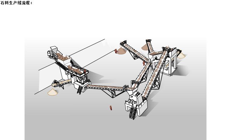 石料生產(chǎn)線的流程大致為:(料倉(cāng))——給料機(jī)——顎式破碎機(jī)——反擊式破碎機(jī)——振動(dòng)篩——(可成成品)。其中間的機(jī)器之間可用輸送機(jī)相接。