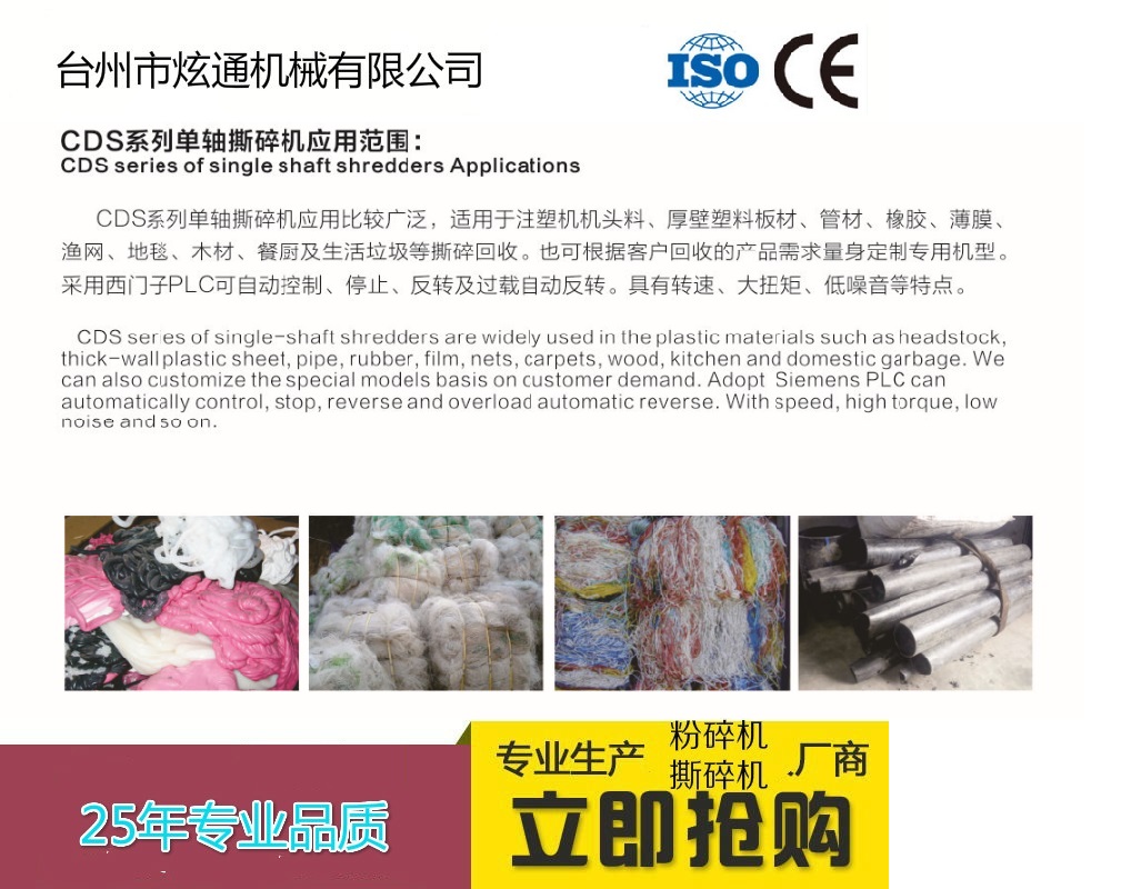 大塊機頭料單軸撕碎機采用歐洲先進技術,主要用于塑膠行業(yè)中各種厚壁廢舊料,邊角料的撕碎回收,對特厚、韌性、大型物料(特大機頭料、水口料、澆口料、大型塑料管材管件、大口徑厚壁PE管材、PE機頭料、塑料包裝桶、大捆打包塑料薄膜、大捆打包噸包袋編織袋、卷膜、紙張、纖維、塑料箱筐、塑料垃圾桶、電視機殼、電腦殼、打印機外殼、叉車托板、塑膠卡板、塑料周轉(zhuǎn)箱等)能有效撕碎破碎粉碎,且適合塑料、橡膠、木材各種材料破碎粉碎回收。