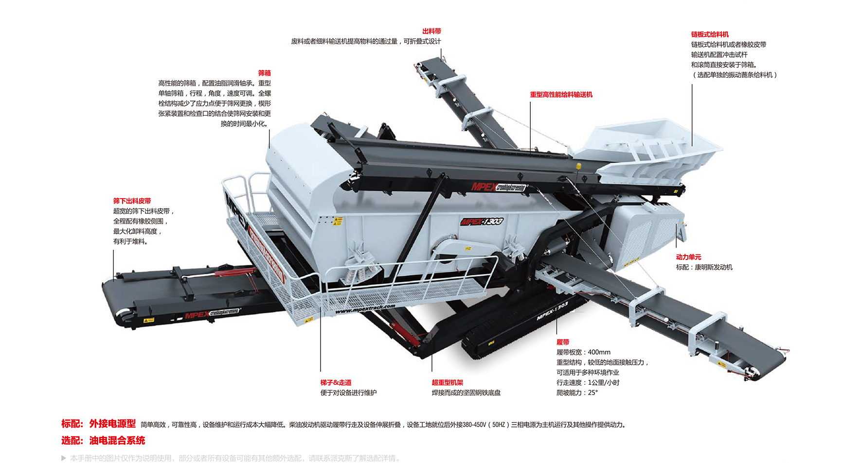 MPEX移動傾斜式篩分設備配置重型高性能帶式給料機,重型傾斜式篩箱,產(chǎn)量大,有效分離。廣泛應用于各種破碎篩分工藝中的篩分作業(yè),包括采石場,礦山,建筑拆除碎片處理,表層土處理,物料再生利用,沙礫篩分,煤礦和骨料篩分等。