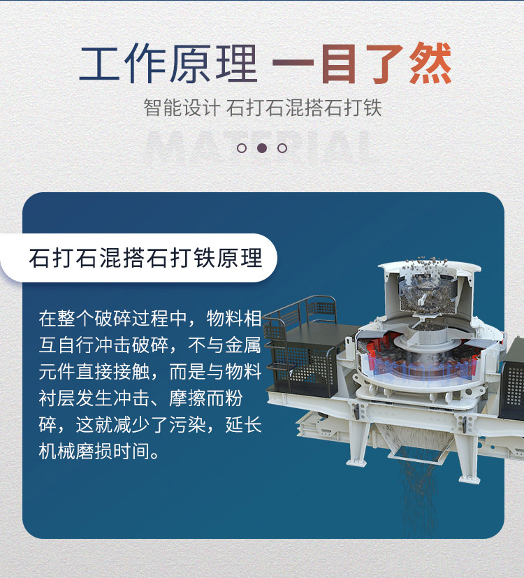 ML系列沖擊式制砂機(jī)設(shè)計(jì)了兩種速切換破碎腔方式:石打石、石打鐵破碎腔,滿足不同形式的加工需求;同時(shí),高質(zhì)量耐磨材料打造的機(jī)身,堅(jiān)固耐用的同時(shí)兼具外形優(yōu)雅,智能化稀油潤(rùn)滑系統(tǒng)的設(shè)計(jì),不僅可以實(shí)現(xiàn)全自動(dòng)潤(rùn)滑,控缺油保護(hù),還能夠使設(shè)備無(wú)論是應(yīng)用于硬巖的制砂和整形作業(yè)、礦石的細(xì)碎作業(yè)還是建筑垃圾、尾礦等固廢的處理,都能發(fā)揮出其獨(dú)特的性能。