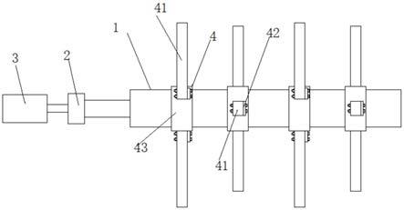 轉(zhuǎn)動軸1上設(shè)有多個刀片組4;相鄰刀片組4中的旋耕機刀齒41錯位分布;這樣的設(shè)置,使得各個刀片組4對污泥打散時;所有刀片組4中的旋耕機刀齒不會同時與污泥相接觸,這樣可以減少打散機構(gòu)瞬間受到過大的阻力而不利于打散機構(gòu)正常工作的問題;換言之,可以降低驅(qū)動電機3的負(fù)載