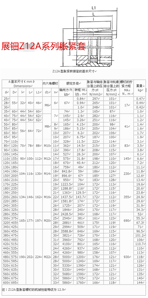Z12a型系列脹緊套型號如下:Z12a-25×55 、Z12a-28×55 、Z12a-30×55、Z12a-35×60、Z12a-40×75、Z12a-45×75、Z12a-50×80、Z12a-55×85、Z12a-60×90、Z12a-65×95、Z12a-70×110、Z12a-80×120、Z12a-90×130、Z12a-100×145、Z12a-110×155、Z12a-120×165、Z12a-130×180、Z12a-140×190 、Z12a-150×200、Z12a-160×210、Z12a-170×225、Z12a-180×235 、Z12a-190×250 、Z12a-200×260 、Z12a-220×285 、Z12a-240×305 、Z12a-260×325 、Z12a-280×355 、Z12a-300×375 、Z12a-320×405 、Z12a-340×425 、Z12a-360×455 、Z12a-380×475 、Z12a-400×495 、Z12a-420×515 、Z12a-440×535 、Z12a-460×555 、Z12a-480×575 、Z12a-500×595 、Z12a-520×615 、Z12a-540×635 、Z12a-560×655 、Z12a-580×675 、Z12a-600×695。注:Z12A型脹緊聯(lián)結套螺釘?shù)臋C械性能等級為12.9級。
