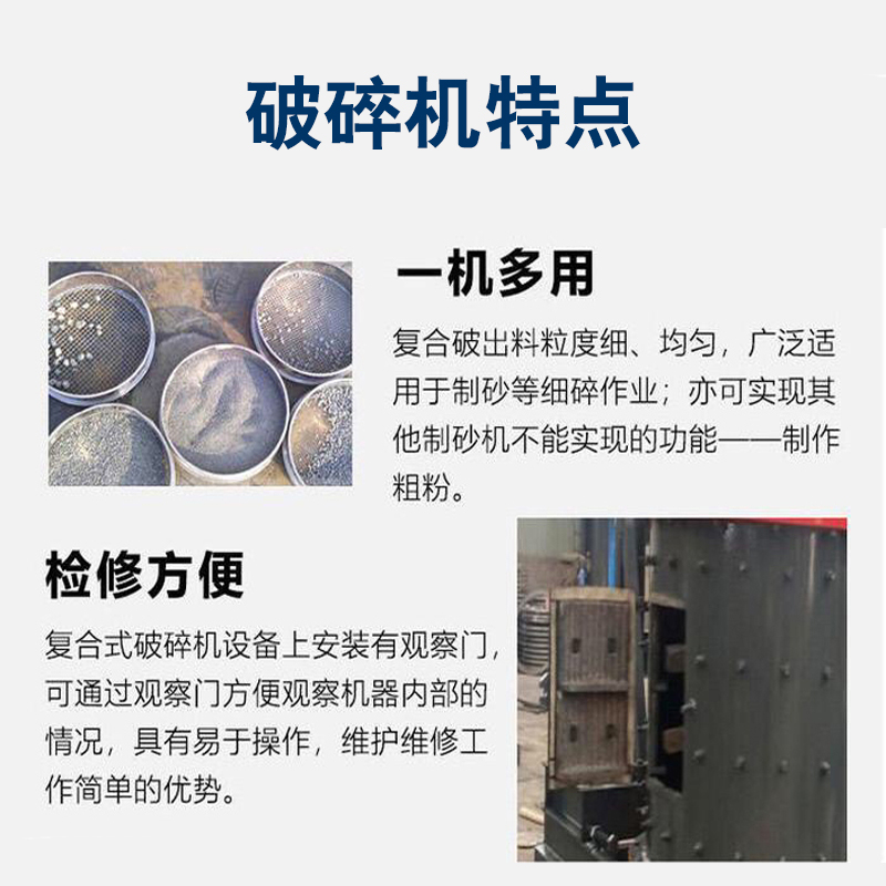 復(fù)合式破碎機(jī)簡(jiǎn)稱為復(fù)合破,是破碎生產(chǎn)線和制砂生產(chǎn)線中常用設(shè)備之一。復(fù)合破碎機(jī)是一種無(wú)篩條、可調(diào)式細(xì)碎設(shè)備,可廣泛適用于水泥廠的生料、熟料細(xì)碎作業(yè),同時(shí)也可用于白云石、焦寶石、鉛鋅礦、蛇紋石、高爐渣、煤矸石、磷礦石等中等硬度物料的細(xì)碎作業(yè),特別適用于硬質(zhì)石灰?guī)r、白云巖、花崗巖、玄武巖等人工造砂或高速公路路面石料的加工破碎。