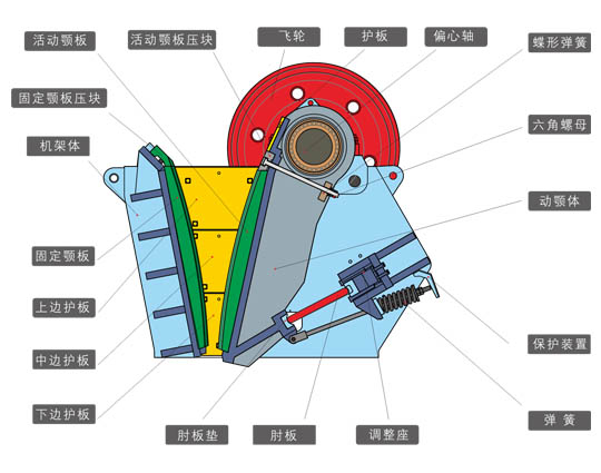 該系列破碎機破碎方式為曲動擠壓型,當動鄂下行時,肘板與動鄂間夾角變小,動鄂板在拉桿,彈簧的作用下,離開固定鄂板,此時已破碎物料從破碎腔下口排出。隨著電動機連續(xù)轉(zhuǎn)動而破碎機動鄂作周期性地壓碎和排泄物料,實現(xiàn)批量生產(chǎn)。