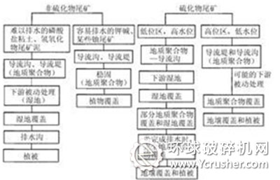 為了減少含硫化物尾礦庫區(qū)向環(huán)境排放酸性水,可有各種方案,包括壓密粘土覆蓋;合成膜覆蓋;接種細(xì)菌;表面填加石灰石;導(dǎo)流溝;充填堿、其它化學(xué)品或生物溝;排至湖內(nèi);化學(xué)處理;下游濕地;濕地覆蓋;土壤和植物覆蓋;形成硬殼;穩(wěn)固地表(地質(zhì)聚合物)。