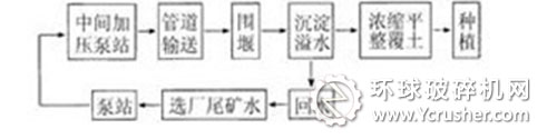 溢流管每隔20m設(shè)一排尾礦管,一池排尾礦,排滿后,干燥20天,再平整,在上部復(fù)土大于30㎝后可種植農(nóng)作物,然后尾礦管轉(zhuǎn)排相鄰另一池,重復(fù)上述作業(yè),其復(fù)墾工藝示意圖見圖2。工藝流程見圖3。