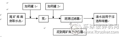 本方案使用公司的專利產品班德過濾器作為尾礦水處理的主要裝置。我們以如下工藝流程示意圖進行說明:
