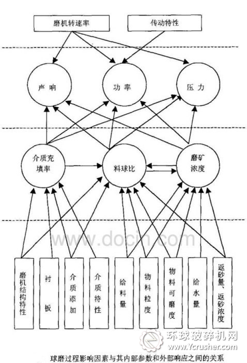 這里主要研究的任何是確定和優(yōu)化水泥球磨機的內(nèi)部參數(shù),因此,以水泥球磨機內(nèi)部參數(shù)和外部響應(yīng)為中心研究水泥球磨機各個影響因素之間的相互關(guān)系(如下圖所示)。